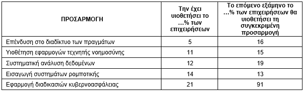 Πρωτοβουλίες όπως η χρήση συστημάτων ρομποτικής, η υιοθέτηση εφαρμογών τεχνητής νοημοσύνης, οι επενδύσεις στο διαδίκτυο των πραγμάτων κλπ., φαίνεται ότι θα υιοθετηθούν από τη βιομηχανία, αλλά με αργούς ρυθμούς και σε βάθος χρόνου. Παρά ταύτα, αποτελεί θετικό μήνυμα για την ψηφιακή μετάβαση η εκπαίδευση και επιμόρφωση του προσωπικού της βιομηχανίας στις νέες τεχνολογίες.