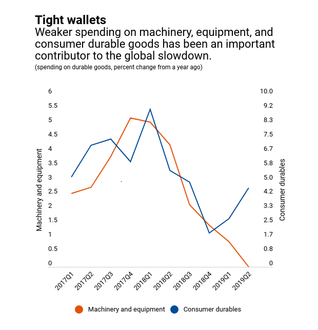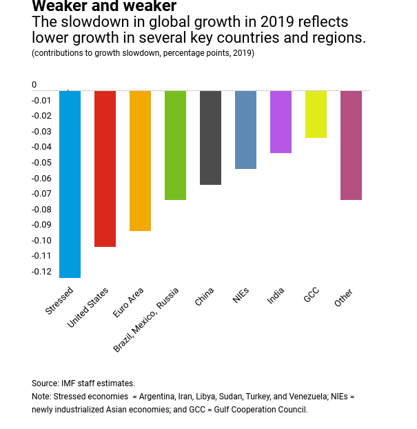 Όπως επισημαίνουν οι συντάκτες του άρθρου, οι λόγοι της επιβράδυνσης εντοπίζονται στα εμπόδια που υψώθηκαν στο διεθνές εμπόριο, ως αποτέλεσμα του εμπορικού πολέμου, ενώ στην περίπτωση των ανεπτυγμένων οικονομικών και της Κίνας, ο εμπορικός πόλεμος επιδείνωσε την επιβράδυνση που είχε ξεκινήσει από πριν.