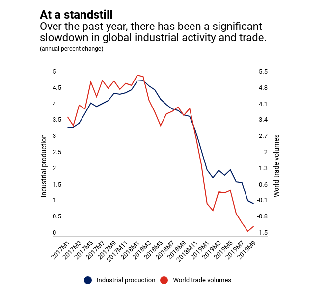 Η μπλε γραμμή δείχνει την παγκόσμια βιομηχανική παραγωγή και η πορτοκαλί γραμμή τον όγκο του διεθνούς εμπορίου.