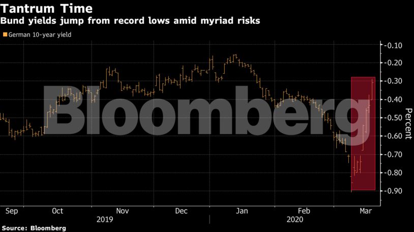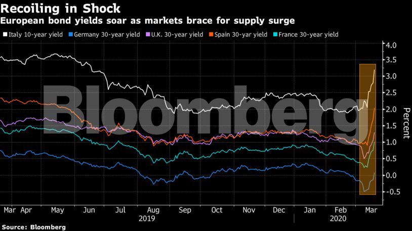 Τα ευρωπαϊκά κρατικά ομόλογα ηγήθηκαν μιας παγκόσμιας πτώσης, καθώς, μετά τις ανακοινώσεις κρατών για δημοσιονομικές δαπάνες ύψους μεγαλύτερου του ενός τρις για την αντιμετώπιση των επιπτώσεων του κορωνοϊού, οι αγορές αναμένουν μια άνευ προηγουμένου αύξηση νέων εκδόσεων.