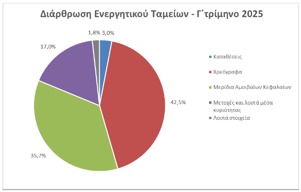 Η αξία των συνολικών τοποθετήσεων των Ταμείων σε χρεωστικούς τίτλους παρέμεινε σχεδόν αμετάβλητη στα 1.165 εκατ. ευρώ στο τέλος του γ΄ τριμήνου του 2025, καθώς οι καθαρές πωλήσεις ομολόγων του εσωτερικού αντισταθμίστηκαν από καθαρές αγορές ομολόγων του εξωτερικού. Το ποσοστό των χρεωστικών τίτλων επί του συνολικού ενεργητικού μειώθηκε στο 42,5% το γ΄ τρίμηνο, έναντι 44,1% το προηγούμενο τρίμηνο.