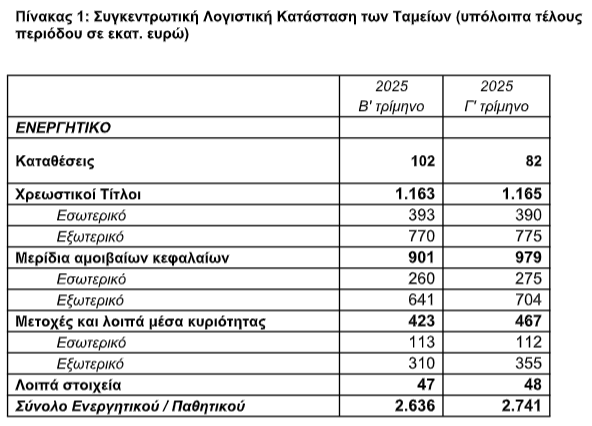 Η συνολική αξία του ενεργητικού των Ταμείων Επαγγελματικής Ασφάλισης αυξήθηκε κατά 4,0% και διαμορφώθηκε στα 2.741 εκατ. ευρώ στο τέλος του γ΄ τριμήνου του 2025, έναντι 2.636 εκατ. ευρώ το προηγούμενο τρίμηνο.