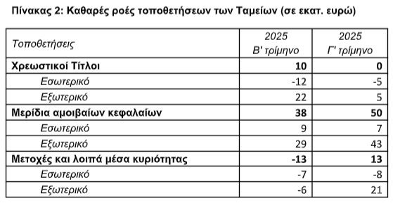 Η αξία των συνολικών τοποθετήσεων σε μετοχές και λοιπά μέσα κυριότητας αυξήθηκε στα 467 εκατ. ευρώ στο τέλος του γ΄ τριμήνου του 2025, έναντι 423 εκατ. ευρώ το προηγούμενο τρίμηνο, εξέλιξη που οφείλεται τόσο σε καθαρές αγορές μετοχών του εξωτερικού όσο και σε άνοδο των αποτιμήσεών τους. Το ποσοστό των τοποθετήσεων σε μετοχές επί του συνόλου του ενεργητικού αυξήθηκε στο 17,0%, το γ΄ τρίμηνο του 2025, έναντι 16,0% το προηγούμενο τρίμηνο.