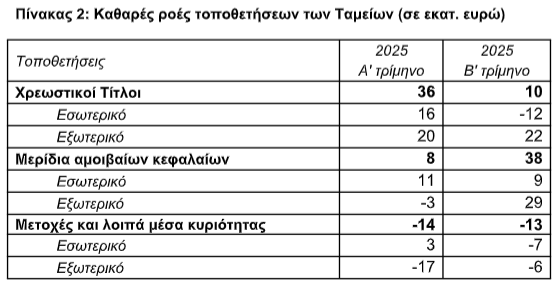Η αξία των συνολικών τοποθετήσεων σε μετοχές και λοιπά μέσα κυριότητας παρέμεινε αμετάβλητη στα 423 εκατ. ευρώ στο τέλος του β΄ τριμήνου του 2025. Οι καθαρές πωλήσεις που σημειώθηκαν σε μετοχές του εσωτερικού και του εξωτερικού αντισταθμίστηκαν πλήρως από την άνοδο των αποτιμήσεων του συνόλου των μετοχών. Το ποσοστό των τοποθετήσεων σε μετοχές επί του συνόλου του ενεργητικού μειώθηκε στο 16,0%, το β΄ τρίμηνο του 2025, έναντι 16,6% το προηγούμενο τρίμηνο.