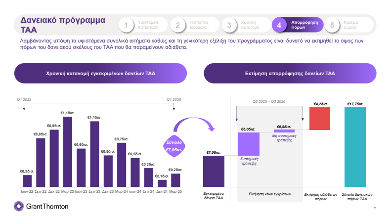 Πόροι ύψους 4,2 δισ. ευρώ σύμφωνα με εκτιμήσεις της Grant Thornton από το δανειακό πρόγραμμα του Ταμείου Ανάκαμψης, είναι πιθανόν να εγγραφούν ως αδιάθετοι πόροι του Ταμείου προς τη χώρα μας. Η εκτίμηση αυτή του οίκου λαμβάνει υπόψη τα υφιστάμενα συνολικά αιτήματα καθώς και τη γενικότερη εξέλιξη του προγράμματος.
