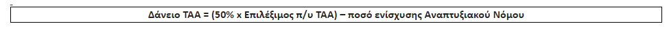 Σε περίπτωση ενίσχυσης από τον Αναπτυξιακό Νόμο (επιδότηση ή φοροαπαλλαγή) για το ίδιο επενδυτικό σχέδιο, το ποσό της ενίσχυσης αυτής αθροιζόμενο με το ποσό δανείου ΤΑΑ δεν μπορεί να υπερβαίνει το 50% των επιλέξιμων για το ΤΑΑ δαπανών. Επομένως: