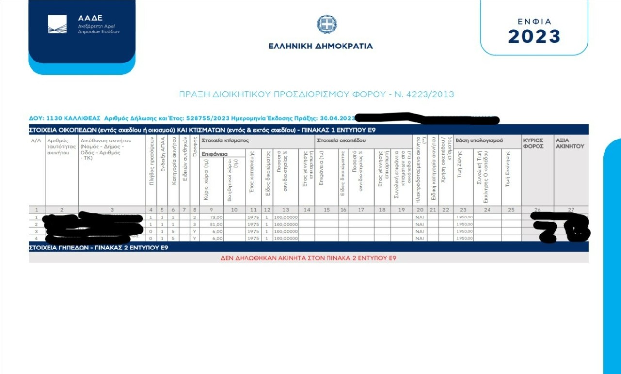Ιδιαίτερη προσοχή πρέπει να δώσουν οι ιδιοκτήτες ακινήτων που θα πρέπει να ελέγξουν τα εκκαθαριστικά του ΕΝΦΙΑ που έλαβαν. Τα εκκαθαριστικά του ΕΝΦΙΑ θα πρέπει να ελεγχθούν κωδικό προς κωδικό από τους φορολογούμενους (στην 2η σελίδα υπάρχει αναλυτικός πινάκας – βλ. φωτο) προκειμένου να διαπιστώσουν αν τα στοιχεία των ακινήτων τους ανταποκρίνονται στην πραγματικότητα. Σε περίπτωση που οι ιδιοκτήτες διαπιστώσουν ότι χρεώθηκαν με επιπλέον ποσά του φόρου ακινήτων θα πρέπει να ελέγχουν εάν έχουν συμπληρώσει ορθά το Ε9. Στην περίπτωση που διαπιστώσουν ότι όντως συμπλήρωσαν λανθασμένα ή με παραλείψεις τα στοιχεία των ακινήτων τους και έχουν χρεωθεί άδικα με παραπάνω ΕΝΦΙΑ στα φετινά εκκαθαριστικά, θα πρέπει να υποβάλουν τροποποιητικές δηλώσεις Ε9 με τις οποίες θα δηλώσουν ορθά τα ακίνητα που κατείχαν την 1η-1-2023.