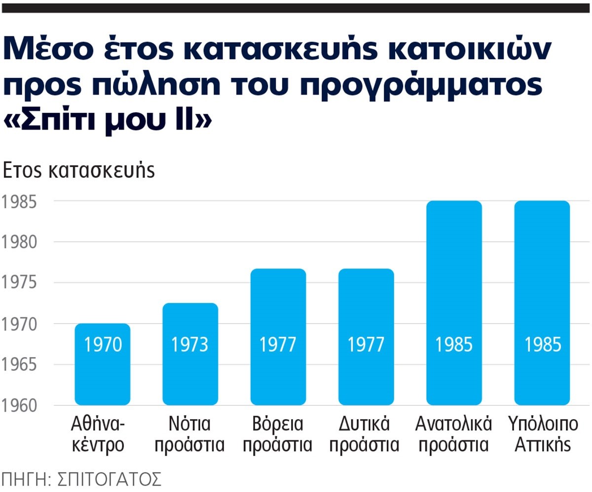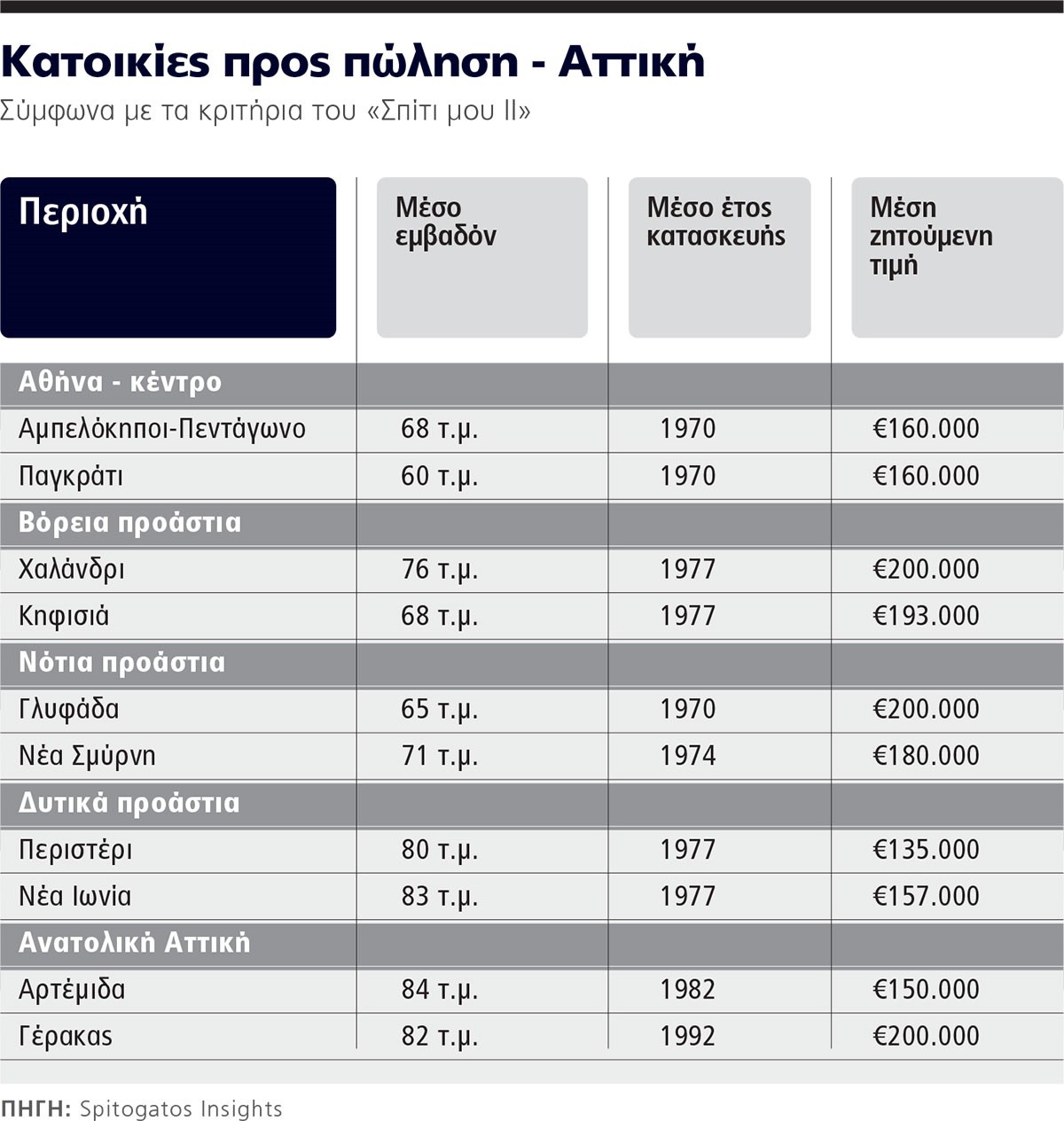 Τα στοιχεία προκύπτουν μέσα από τα πραγματικά δεδομένα των αγγελιών στην πλατφόρμα του Spitogatos , τη γνωστή ιστοσελίδα αγγελιών ακινήτων. Ενδεικτικά, στην περιοχή των Αμπελοκήπων – Πενταγώνου που αποτελεί τη μία από τις δύο δημοφιλέστερες περιοχές του κέντρου της Αθήνας για την αγορά σπιτιού, όπως προκύπτει με βάση γενικότερα τις αναζητήσεις, μία κατοικία που θα μπορούσε να αποκτηθεί μέσω του προγράμματος «Σπίτι μου ΙΙ» έχει μέση ζητούμενη τιμή 160.000 ευρώ, μέσο εμβαδόν 68 τ.μ. και μέσο έτος κατασκευής το 1970, 55 χρόνια πίσω. Στο Παγκράτι, τη δεύτερη δημοφιλέστερη περιοχή, επίσης το μέσο έτος κατασκευής είναι το 1970 με μια μέση επιφάνεια 60 τ.μ. και μέση ζητούμενη τιμή με βάση τις αγγελίες στις 160.000 ευρώ, λίγο χαμηλότερα των 2.700 ευρώ ανά τ.μ.