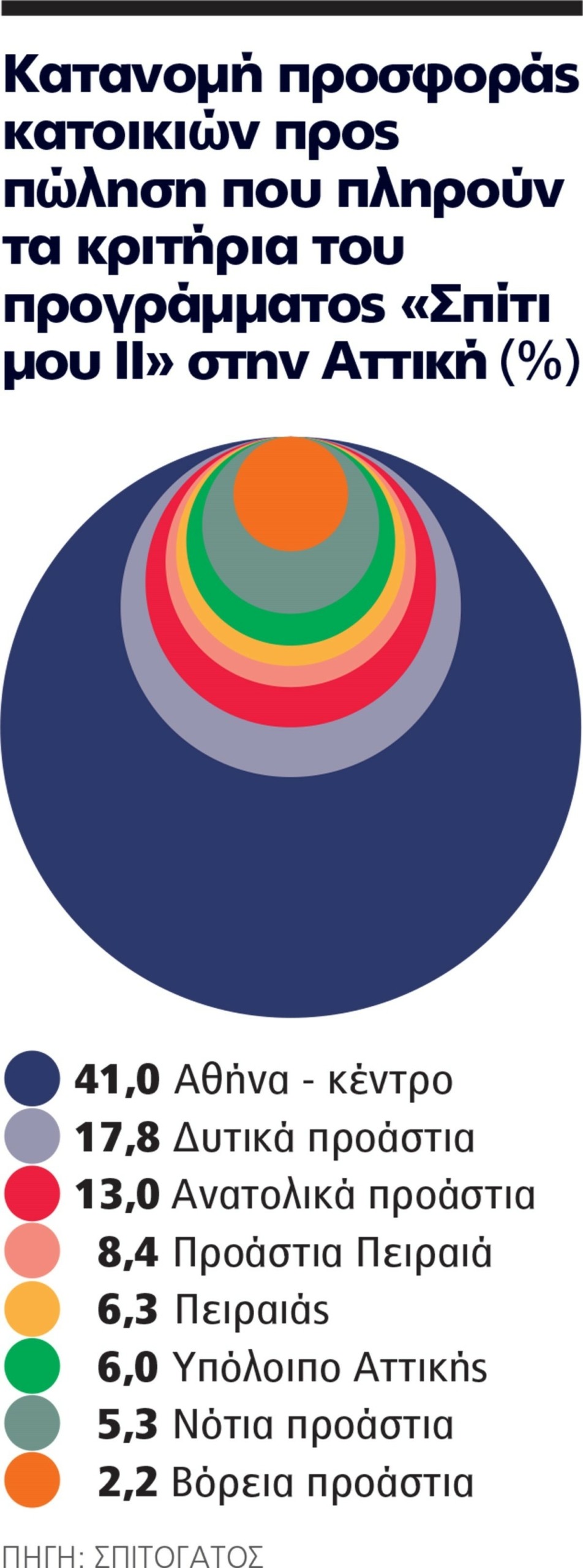 Φθηνές επιλογές, όμως, με σπίτια μεγαλύτερης παλαιότητας, σχεδόν 50ετίας, προσφέρουν τα δυτικά προάστια όπου με βάση την ανάλυση της κατανομής των διαθέσιμων κατοικιών προς πώληση συγκεντρώνεται το 17,8% των διαθέσιμων κατοικιών που θα μπορούσαν να αγοραστούν μέσω του «Σπίτι μου ΙΙ», το δεύτερο μεγαλύτερο ποσοστό μετά το κέντρο της Αθήνας, όπου η αντίστοιχη διαθεσιμότητα είναι στο 41%. Ενδεικτικά, μια μέση κατοικία στο Περιστέρι που πληροί τα κριτήρια του προγράμματος είναι ηλικίας του 1977, επιφάνειας 80 τ.μ., με μέση ζητούμενη τιμή, όπως προκύπτει από τις αγγελίες, στις 135.000 ευρώ. Στη Νέα Ιωνία η μέση ζητούμενη τιμή ανεβαίνει στις 157.000 ευρώ ή αλλιώς στα 1.900 ευρώ ανά τ.μ. περίπου για ένα σπίτι επίσης του 1977 με μέση επιφάνεια τα 83 τ.μ.