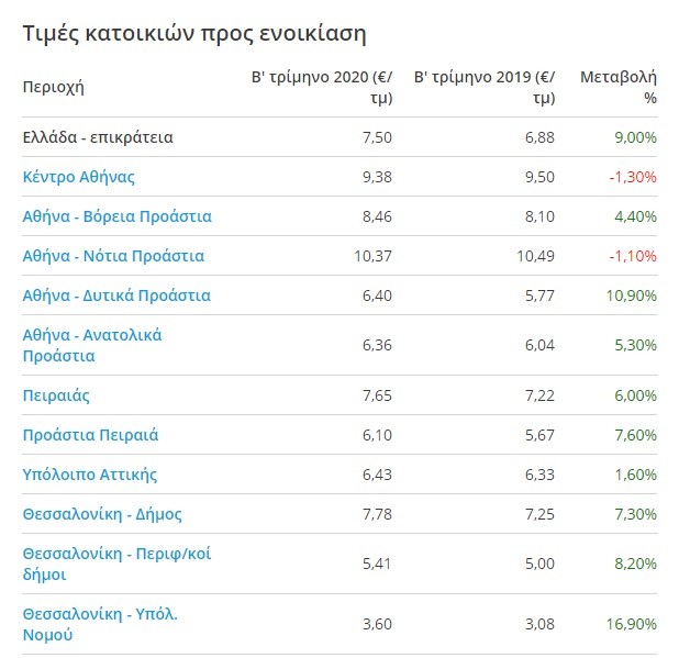 Μεγαλύτερη είναι η διαφορά στο κομμάτι των ενοικιάσεων, παρά το γεγονός ότι θεωρητικά λόγω της πτώσης των βραχυχρόνιων τουριστικών μισθώσεων και της αύξησης της προσφοράς οι τιμές θα έπρεπε να είναι χαμηλότερα τώρα: Συγκριτικά με πέρυσι το ίδιο διάστημα η αύξηση στις τιμές των ενοικίων είναι στο 9% με τη μέση τιμή τώρα να διαμορφώνεται ανά την Επικράτεια στα 7,5 ευρώ από 6,88 ευρώ το β’ τρίμηνο του 2019. Αύξηση κατά 1,7% παρατηρείται και σε σχέση με το πρώτο τρίμηνο του 2020, όπου η μέση τιμή ήταν στα 7,37 ευρώ πανελλαδικά, με βάση πάντα τις δημοσιευμένες αγγελίες του δικτύου.
