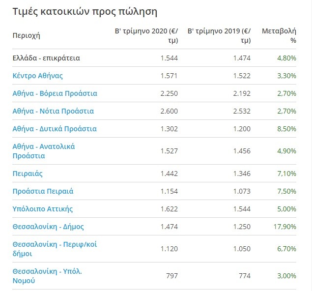 Ως προς τις πωλήσεις κατοικιών, η μέση τιμή στο κέντρο της Αθήνας είναι στα 1.571 ευρώ ανά τ.μ. στο β’ τρίμηνο του 2020, αυξημένη κατά 3,3%. Κατά τη διάρκεια του Απριλίου-Μαϊου-Ιουνίου 2020, η υψηλότερη μέση τιμή για τα σπίτια προς πώληση ήταν στα νότια Προάστια, με 2.600 ευρώ ανά τετραγωνικό μέτρο και άνοδο κατά 2,7% σε σχέση με πέρυσι. Εντυπωσιακή αύξηση σημειώνουν οι τιμές πώλησης των κατοικιών στο δήμο της Θεσσαλονίκης με ένα +17,9% και μία μέση ζητούμενη τιμή από τους ιδιοκτήτες στα 1.474 ευρώ ανά τ.μ..
