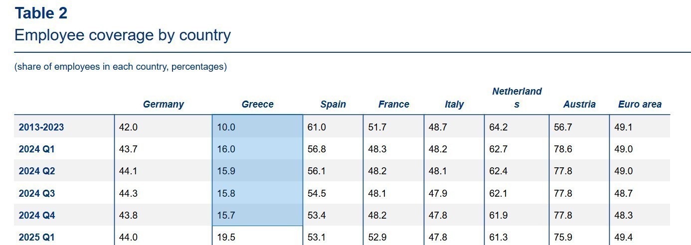 Για την Ελλάδα, ιδιαίτερο ενδιαφέρον παρουσιάζουν τα στοιχεία που καταγράφουν την απόσταση που χωρίζει την χώρα από τις υπόλοιπες της Ευρωζώνης, σε ότι αφορά στο ποσοστό των εργαζομένων που καλύπτονται από τις συλλογικές συμβάσεις εργασίας.