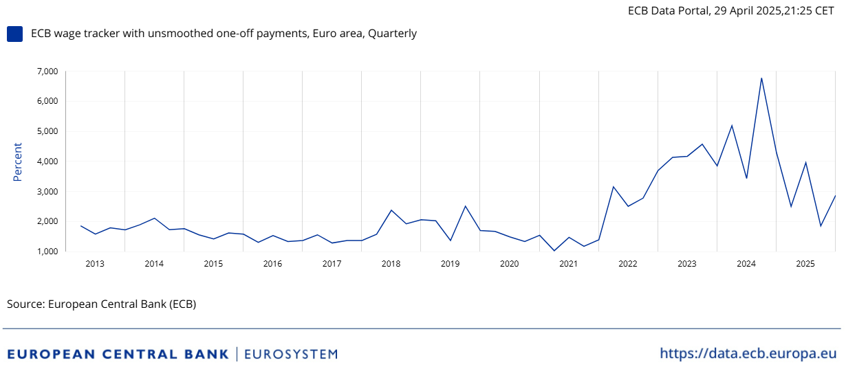 Για το 2025, η ΕΚΤ προβλέπει ότι οι αυξήσεις μισθών θα περιοριστούν (αν δεν ληφθούν υπόψη οι εφάπαξ καταβολές -one off payments- στους εργαζομένους) σε 2,8% από 4,9% το 2024. Ο δείκτης μισθών, εφόσον εξαιρεθούν οι εφάπαξ καταβολές, δείχνει αύξηση 3,8% 2025 (από 4,2% το 2024.)