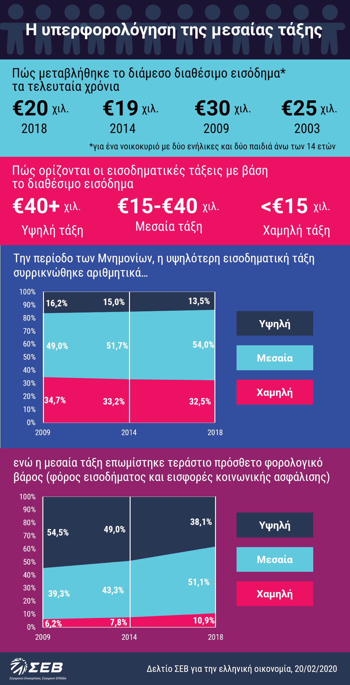Σήμερα, επισημαίνει ο ΣΕΒ στο καθιερωμένο δελτίο του, η μεσαία τάξη φαίνεται να βρίσκεται σε καθοδική πορεία, καθώς οι ευκαιρίες για κοινωνική και επαγγελματική άνοδο περιορίζονται, ενώ η κοινωνική κινητικότητα εν γένει έχει χάσει τη δυναμική άλλων εποχών.