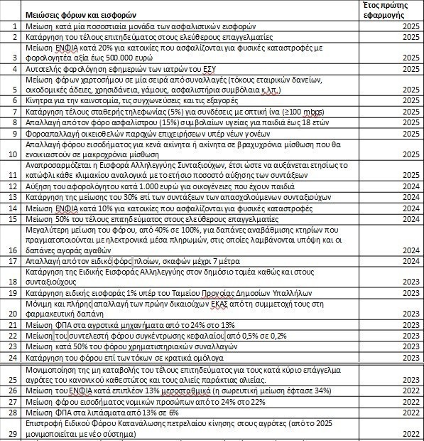 Στην πορεία η λίστα των φοροελαφρύνσεων 2019-2025 περιέλαβε πολλές περισσότερες μειώσεις άμεσων φόρων για τα νοικοκυριά (από 22% σε 9% για τα πρώτα 10.000 ευρώ), αύξηση αφορολογήτου για οικογένειες με παιδιά, νέες ελαφρύνσεις στον ΕΝΦΙΑ ή και σε άλλα βάρη για τους ιδιοκτήτες ακινήτων, φορολογικά κίνητρα για επιχειρήσεις, αλλά και πλήρη κατάργηση τελών και φόρων που επιβλήθηκαν στα Μνημόνια, όπως το τέλος επιτηδεύματος.