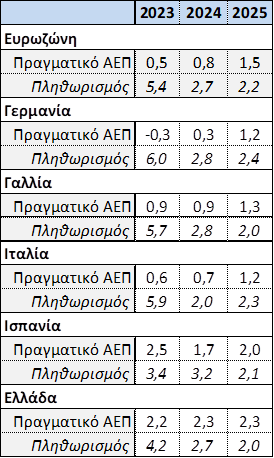 Στην Ευρωζώνη, αντίθετα, οι προκλήσεις παραμένουν. Ο ρυθμός ανάπτυξης το δ΄ τρίμηνο του 2023 ήταν μηδενικός σε τριμηνιαία βάση και μόλις 0,1% σε ετήσια. Βάσει της εξέλιξης των πρόδρομων οικονομικών δεικτών, η εικόνα αυτή κατά το α΄ τρίμηνο του 2024 δεν αναμένεται να βελτιωθεί σημαντικά. Παράλληλα, ο πληθωρισμός επιβραδύνεται με πολύ αργό ρυθμό. Ωστόσο, ιστορικά χαμηλό παραμένει το ποσοστό ανεργίας.