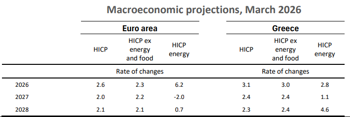 Για το σύνολο του 2026, ο εναρμονισμένος πληθωρισμός στην Ελλάδα προβλέπεται να ενισχυθεί στο 3,1% από 2,9% το προηγούμενο έτος. Η πρόβλεψη αυτή ενσωματώνει την επιμονή του πληθωρισμού στις υπηρεσίες, η οποία τροφοδοτείται από τις αυξήσεις σε μισθούς και ενοίκια, καθώς και από τις πιέσεις λόγω της υψηλής τουριστικής ζήτησης.