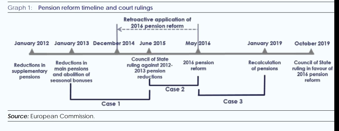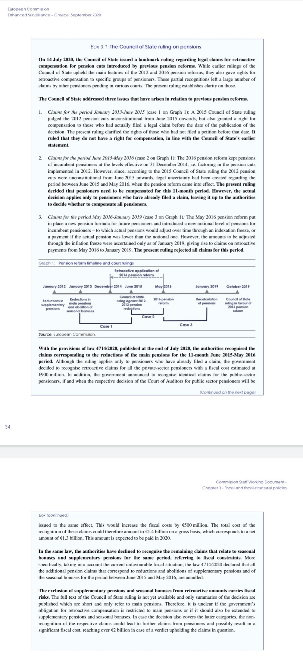 - Για την απόφαση της κυβέρνησης όμως να επιστρέψει αναδρομικά 11 μηνών, μόνον για τις κύριες συντάξεις, η Κομισιόν κρατά ισχυρές επιφυλάξεις: «Ο αποκλεισμός των επικουρικών συντάξεων και των εποχιακών “δώρων” από αναδρομικά ποσά συνεπάγεται δημοσιονομικής φύσεως κινδύνους. Το πλήρες κείμενο της απόφασης του Συμβουλίου της Επικρατείας δεν είναι ακόμη διαθέσιμο (σσ: μέχρι τη σύνταξη του της Έκθεσης) και υπάρχουν δημοσιευμένες μόνο περιλήψεις (only summaries) της απόφασης, οι οποίες είναι σύντομες και αναφέρονται μόνο στις κύριες συντάξεις. Επομένως, δεν είναι σαφές εάν η υποχρέωση καταβολής αναδρομικής περιορίζεται στις κύριες συντάξεις ή εάν πρέπει επίσης να επεκταθεί σε επικουρικές και δώρα. Σε περίπτωση που η απόφαση καλύπτει επίσης τις τελευταίες κατηγορίες, η μη αναγνώριση των αντίστοιχων απαιτήσεων θα μπορούσαν να οδηγήσουν σε περαιτέρω απαιτήσεις από συνταξιούχους και πιθανόν να οδηγήσουν σε σημαντικό δημοσιονομικό κόστος, ξεπερνώντας τα 2 δισεκατομμύρια ευρώ σε περίπτωση ετυμηγορίας που επιβεβαιώνει τις εν λόγω αξιώσεις».