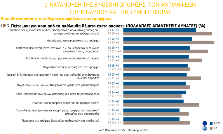 Σύμφωνα με τα ευρήματα, το ποσοστό των Ευρωπαίων πολιτών που δηλώνουν ότι γνωρίζουν τη λειτουργία του συστήματος ασφάλειας τροφίμων της ΕΕ έχει αυξηθεί κατά 6 ποσοστιαίες μονάδες από το 2022. Ολοένα και αυξανόμενος αριθμός Ευρωπαίων έχει ακούσει για συγκεκριμένα θέματα ασφάλειας τροφίμων, με πιο γνωστά από αυτά να είναι τα πρόσθετα τροφίμων (71%) και τα φυτοφάρμακα (67%). Αξιοσημείωτες αυξήσεις παρατηρήθηκαν στην ευαισθητοποίηση σχετικά με τις ασθένειες των ζώων (65%, αύξηση 5 ποσοστιαίων μονάδων), τα μικροπλαστικά στα τρόφιμα (63%, αύξηση 8 ποσοστιαίων μονάδων) και τις τροφικές δηλητηριάσεις (62%, αύξηση 5 ποσοστιαίων μονάδων).