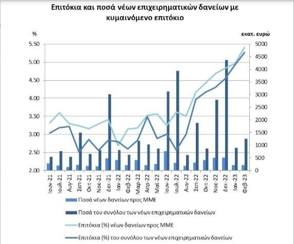 Το μέσο επιτόκιο των νέων επιχειρηματικών δανείων με συγκεκριμένη διάρκεια και κυμαινόμενο επιτόκιο αυξήθηκε κατά 35 μονάδες βάσης, το Φεβρουάριο του 2023, και διαμορφώθηκε στο 5,27%. Το μέσο επιτόκιο των δανείων τακτής λήξης με κυμαινόμενο επιτόκιο προς μικρομεσαίες επιχειρήσεις (ΜΜΕ) αυξήθηκε κατά 46 μονάδες βάσης και διαμορφώθηκε στο 5,42%.