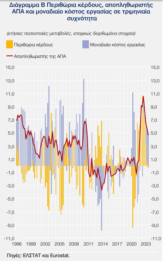 Σύμφωνα με την Έκθεση, η αύξηση στα περιθώρια κέρδους ήταν μία μόνο από τους παράγοντες στους οποίους οφείλονται τα υψηλά επίπεδα του πληθωρισμού κατά τη διάρκεια των τελευταίων ετών στις οικονομίες των χωρών της ευρωζώνης. Ειδικά για την ελληνική οικονομία, η ανάλυση της ΤτΕ (με βάση στοιχεία εθνικών λογαριασμών) έδειξε ότι την περίοδο 2021-2022 σημειώθηκε σημαντική αύξηση των περιθωρίων κέρδους.