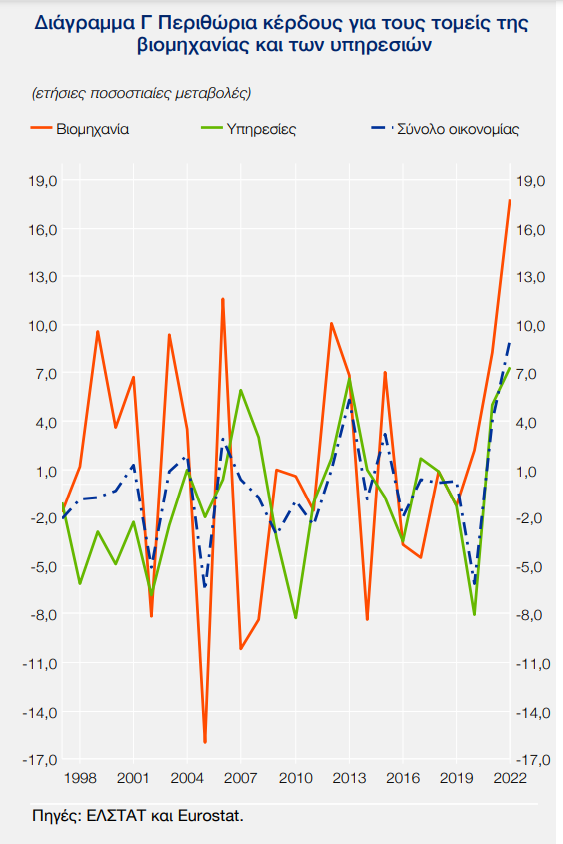 • στο βιομηχανικό τομέα (βιομηχανία και κατασκευές) ο ρυθμός μεταβολής των περιθωρίων κέρδους διαμορφώθηκε σε ιστορικώς υψηλά επίπεδα, φθάνοντας στο 17,8% το 2022