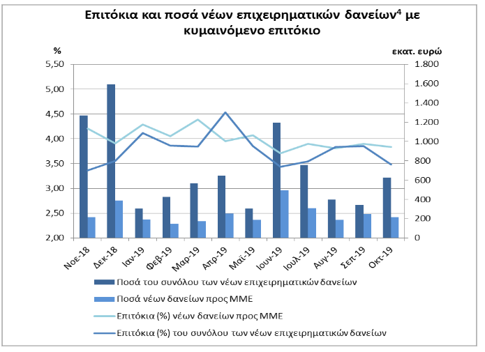 Το μέσο επιτόκιο των επιχειρηματικών δανείων με συγκεκριμένη διάρκεια και κυμαινόμενεπιτόκιο 3 μειώθηκε κατά 36 μονάδες βάσης και διαμορφώθηκε στο 3,47%, τον Οκτώβριο του 2019, ενώ το ποσό των νέων δανείων 4 αυξήθηκε σε 625 εκατ. ευρώ έναντι 340 εκατ. ευρώ κατά τον προηγούμενο μήνα. Ειδικότερα, τo μέσο επιτόκιο των δανείων τακτής λήξης με κυμαινόμενο επιτόκιο προς μικρομεσαίες επιχειρήσεις (ΜΜΕ) μειώθηκε κατά 6 μονάδες βάσης και διαμορφώθηκε στο 3,84%, ενώ το αντίστοιχο ποσό των δανείων μειώθηκε σε 214 εκατ. ευρώ τον Οκτώβριο του 2019 έναντι 249 εκατ. ευρώ τον προηγούμενο μήνα (βλ. Διάγραμμα και Πίνακα 1).