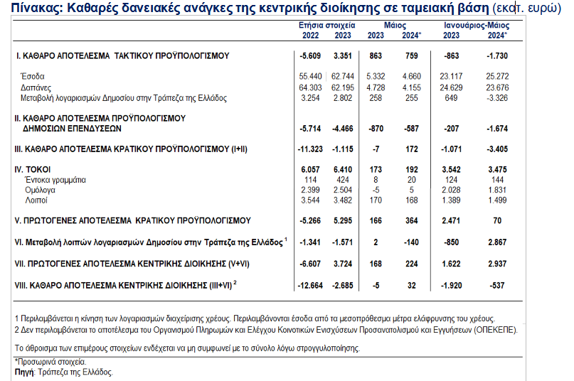 Την περίοδο Ιανουαρίου-Μαΐου 2024, το ταμειακό αποτέλεσμα της κεντρικής διοίκησης παρουσίασε έλλειμμα 537 εκατ. ευρώ, έναντι ελλείματος 1.920 εκατ. ευρώ την αντίστοιχη περίοδο του 2023, σύμφωνα με τα στοιχεία της Τράπεζας της Ελλάδος .
