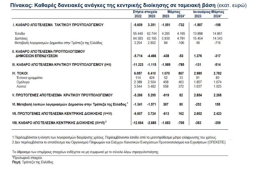 Την περίοδο Ιανουαρίου-Μαρτίου 2024, το ταμειακό αποτέλεσμα της κεντρικής διοίκησης παρουσίασε έλλειμμα 359 εκατ. ευρώ, έναντι ελλείματος 383 εκατ. ευρώ την αντίστοιχη περίοδο του 2023. Κατά την περίοδο αυτή, τα έσοδα του τακτικού προϋπολογισμού διαμορφώθηκαν σε 14.861 εκατ. ευρώ, από 13.898 εκατ. ευρώ πέρυσι.