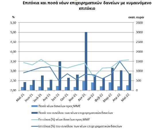 Το μέσο επιτόκιο των νέων επιχειρηματικών δανείων με συγκεκριμένη διάρκεια και κυμαινόμενο επιτόκιο μειώθηκε κατά 60 μονάδες βάσης, το Μάιο του 2022, και διαμορφώθηκε στο 2,89%. Το μέσο επιτόκιο των δανείων τακτής λήξης με κυμαινόμενο επιτόκιο προς μικρομεσαίες επιχειρήσεις (ΜΜΕ) αυξήθηκε κατά 4 μονάδες βάσης και διαμορφώθηκε στο 3,57%.