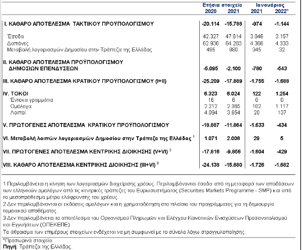 Τον Ιανουάριο του 2022, το ταμειακό αποτέλεσμα της κεντρικής διοίκησης παρουσίασε έλλειμμα 1.682 εκατ. ευρώ, έναντι ελλείμματος 1.726 εκατ. ευρώ τoν αντίστοιχο μήνα του 2021.