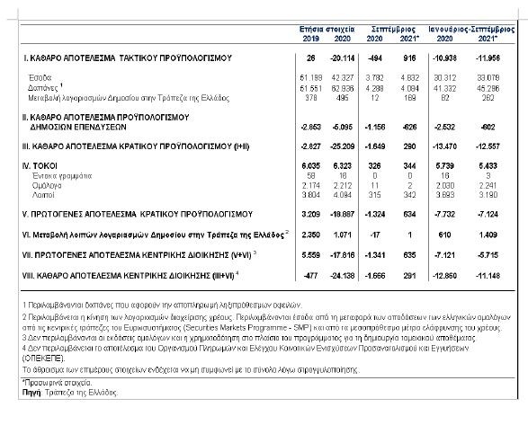 Την περίοδο Ιανουαρίου – Σεπτεμβρίου 2021, το ταμειακό αποτέλεσμα της κεντρικής διοίκησης παρουσίασε έλλειμμα 11.148 εκατ. ευρώ, έναντι ελλείμματος 12.860 εκατ. ευρώ την αντίστοιχη περίοδο του 2020.
