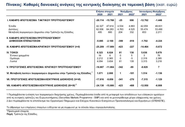 Έλλειμμα ύψους 6.808 εκατ. ευρώ παρουσίασε το ταμειακό αποτέλεσμα της κεντρικής διοίκησης την περίοδο Ιανουαρίου-Νοεμβρίου 2022, ενώ τα έσοδα του τακτικού προϋπολογισμού διαμορφώθηκαν σε 49.831 εκατ. ευρώ, από 42.059 εκατ. ευρώ πέρυσι.