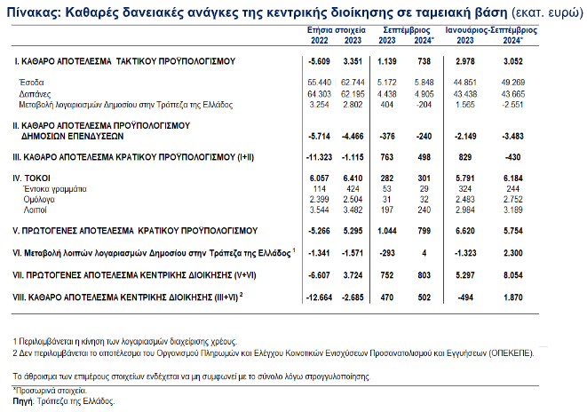 Την περίοδο Ιανουαρίου-Σεπτεμβρίου 2024, το ταμειακό αποτέλεσμα της κεντρικής διοίκησης παρουσίασε πλεόνασμα 1.870 εκατ. ευρώ, έναντι ελλείμματος 494 εκατ. ευρώ την αντίστοιχη περίοδο του 2023.