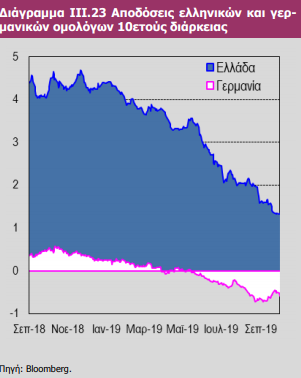 H έκθεση αναφέρει πως η μείωση των αποδόσεων των ελληνικών 10ετών ομολόγων σε ιστορικά χαμηλά επίπεδα δεν αποτελεί από μόνη της έναυσμα για περαιτέρω αναβαθμίσεις του αξιόχρεου της χώρας, δεδομένου και των πολύ χαμηλών -ακόμη και αρνητικών- επιτοκίων που επικρατούν σε άλλες χώρες της Ευρωζώνης για μεγάλο χρονικό διάστημα.