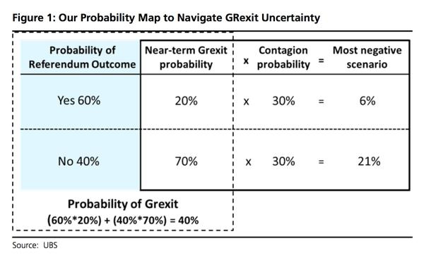 Συνολική πιθανότητα 40% εξόδου της Ελλάδας απ’ την Ευρωζώνη βλέπει η UBS σε έκθεση της πριν το κρίσιμο δημοψήφισμα.