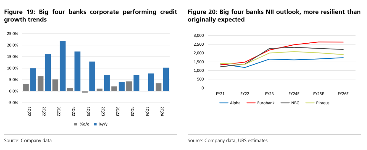 Η ανάπτυξη το 2023 δεν έφτασε τις επίσημες προβλέψεις (και τις προβλέψεις της UBS) κυρίως λόγω των καθυστερήσεων στην απορρόφηση των κονδυλίων της ΕΕ και των επιπτώσεων από τις πλημμύρες του θεσσαλικού κάμπου. Φέτος, τα εισερχόμενα στοιχεία δείχνουν πρόβλεψη για άνοδο του ΑΕΠ στο 2,5%, 0,6% πάνω από το consensus και 0,3% πάνω από την τελευταία επίσημη εκτίμηση της κυβέρνησης για το 2,2%. Επίσης, η αύξηση του ΑΕΠ το 2025 θα είναι στο 3%, εκτίμηση η οποία είναι 1% πάνω από το consensus. Η μεταφορά ανάπτυξης 2,1% για το τρέχον έτος, η συνεχιζόμενη καταναλωτική δύναμη (0,6% σε τριμηνιαία βάση) και η ανάκαμψη των επενδύσεων (μηχανήματα και εξοπλισμός) και η συμβολή των αποθεμάτων ενίσχυσαν το ΑΕΠ. Οι επενδύσεις θα πρέπει να επωφεληθούν από την τρίτη εκταμίευση κεφαλαίων του Ταμείου Σταθερότητας και Ανάπτυξης προς την Ελλάδα (2,3 δισ. ευρώ), με αποτέλεσμα η συνολική απορρόφηση να ανέλθει σε 17,2 δισ. ευρώ από το κονδύλι των 36 δισ. ευρώ του Ταμείου Σταθερότητας και Ανάπτυξης. Επιπλέον, η αύξηση των επιχειρηματικών δανείων έχει επιταχυνθεί και ανήλθε στο 11,4% σε ετήσια βάση τον Αύγουστο. Τέταρτο, τα έσοδα από τον τουρισμό αναμένεται να φθάσουν τα 22 δισ. ευρώ φέτος, ή κατά 7% περίπου πάνω από τις περσινές εισροές.