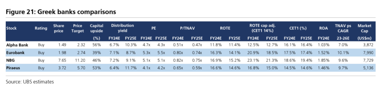 3. Οι μετοχές είναι από τις φθηνότερες, τόσο στο πλαίσιο των ευρωπαϊκών τραπεζών, όσο και στο πλαίσιο των οικονομιών της Ευρώπης, ιδίως σε σχέση με τον δείκτη P/TNAV έναντι του δείκτη αποδοτικότητας ROTE. Η UBS προτιμά τις μετοχές της Εθνικής Τράπεζας για το ποιοτικό franchise της με την υψηλή κερδοφορία και τα πλεονάζοντα κεφάλαια και την Τράπεζα Πειραιώς για την προοπτική re-rating, για το ότι είναι η μεγαλύτερη ελληνική τράπεζα με σταθερή κερδοφορία, καθώς και το ότι βγήκε ισχυρότερη από την κρίση.