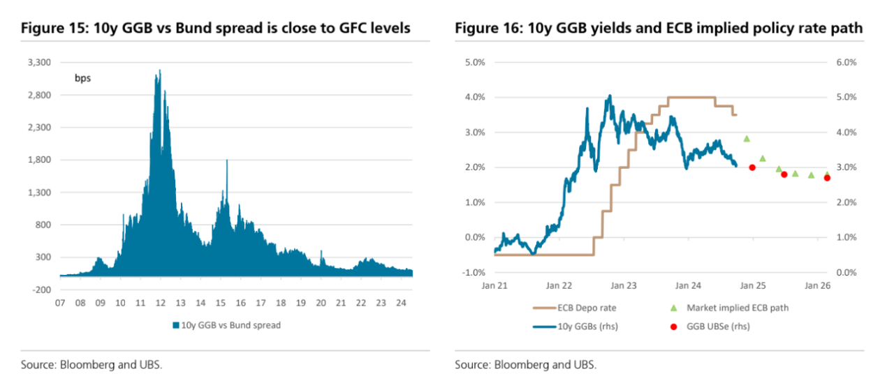 Η επιστροφή της Ελλάδας στην κατηγορία της επενδυτικής βαθμίδας άνοιξε το δρόμο για περαιτέρω συμπίεση των περιθωρίων των αποδόσεων της ελληνικών ομολόγων σε σχέση με τα spreads των γερμανικών ομολόγων. Τα 10ετή ελληνικά spreads διαπραγματεύονται περίπου στις 100 μ.β., επιστρέφοντας σχεδόν στα επίπεδα πριν από την παγκόσμια χρηματοπιστωτική κρίση. Τα ελληνικά ομόλογα έχουν σημειώσει σημαντική ανάκαμψη, ενισχυμένα από τις ισχυρές οικονομικές επιδόσεις της χώρας. Η θετική δυναμική στα ομόλογα θα συνεχιστεί και η πρόσθετη χαλάρωση της πολιτικής της ΕΚΤ και οι αυξανόμενες προσδοκίες για επιτάχυνση των μειώσεων των επιτοκίων, μετά τη μείωση κατά 50 μ.β. της Fed τον Σεπτέμβριο, θα πρέπει να στηρίξουν τις διάρκειες των ευρωπαϊκών ομολόγων. Ο ετήσιος στόχος μας για τα 10ετή ελληνικά ομόλογα είναι 3% έως το τέλος του τρέχοντος έτους και 2,7% έως το τέλος του 2025. Από την άλλη, η δημοσιονομική αβεβαιότητα της Γαλλίας θα διατηρήσει τις πιέσεις στα spreads των ευρωπαϊκών ομολόγων. Είναι δύσκολο τα spreads της Ελλάδας να συμπιεστούν σημαντικά από αυτό το σημείο και αναμένουμε ότι θα παραμείνουν σε ένα εύρος τιμών γύρω από το επίπεδο των 100 μ.β. μέχρι το τέλος του έτους.