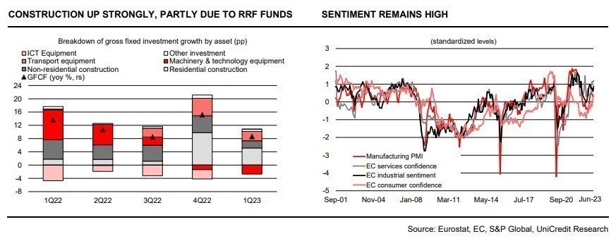Η ιταλική UniCredit Bank αναμένει ότι το φετινό ΑΕΠ θα αυξηθεί κατά 1,8%, κατά 1,5% το 2024, κινούμενη ελαφρώς πάνω από το consensus των εκτιμήσεων των οικονομολόγων. Η αύξηση των εξαγωγών αναμένεται να συνεχίσει να υποστηρίζεται από την εξελισσόμενη ανάκαμψη των διεθνών τουριστικών ροών, οι οποίες είναι πιθανό να επιστρέψουν στα επίπεδα του 2019 έως το τέλος του έτους.