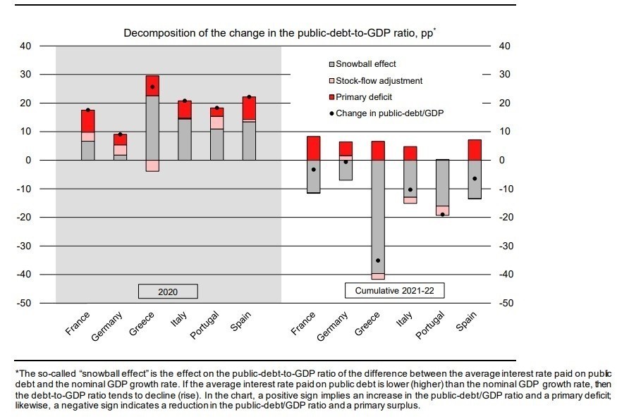 Αυτό όμως που έχει συμβεί, δύο χρόνια μετά, σύμφωνα με τις τελευταίες εκτιμήσεις της Ευρωπαϊκής Επιτροπής, είναι ότι η Ελλάδα έχει σημειώσει σωρευτική μείωση 35 ποσοστιαίων μονάδων στο λόγο δημόσιου χρέους/ΑΕΠ της, ποσοστό σημαντικά μεγαλύτερο από την αύξηση που προκλήθηκε από την κρίση. Η Πορτογαλία έχει επίσης αντιστρέψει πλήρως τον αντίκτυπο που είχε η πανδημική κρίση στο δημόσιο χρέος/ΑΕΠ της, ενώ η Ιταλία το μείωσε σχεδόν στο μισό. Για την Ισπανία εκτιμάται μείωση κατά περίπου 6 ποσοστιαίες μονάδες σε διάστημα δύο ετών και λιγότερο για τη Γαλλία. Η Γερμανία σημείωσε μόνο οριακή μείωση του λόγου δημόσιου χρέους/ΑΕΠ της τα τελευταία δύο χρόνια, αφού είχε σημειώσει συγκριτικά μικρή αύξηση κατά τη διάρκεια της πανδημικής κρίσης.