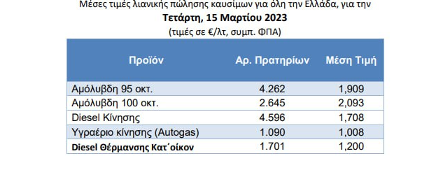 Όπως προκύπτει από τα τελευταία στοιχεία του Παρατηρητηρίου Τιμών στο υπουργείο Ανάπτυξης, η μέση τιμή της αμόλυβδης βρισκόταν την Τετάρτη 15 Μαΐου βρισκόταν στο 1,909 ευρώ/λίτρο, ενώ το diesel στα 1,708 ευρώ/λίτρο.
