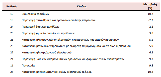 Ειδικότερα, στη μείωση αυτή συνέβαλαν κυρίως οι μεταβολές των δεικτών των διψήφιων κλάδων της ταξινόμησης NACE Αναθ. 2, ως εξής: