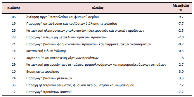 Στη μείωση του Γενικού Δείκτη Τιμών Εισαγωγών (σύνολο αγοράς) κατά 2,8% συνέβαλαν κυρίως οι μεταβολές των δεικτών των διψήφιων κλάδων της ταξινόμησης NACE Αναθ. 2, ως εξής: