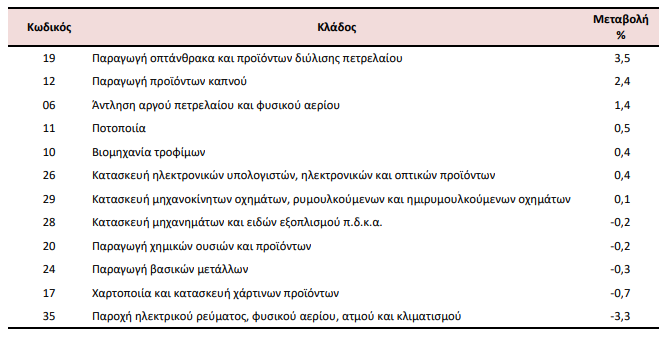 Στην αύξηση του Γενικού Δείκτη Τιμών Εισαγωγών (σύνολο αγοράς) κατά 0,5%, συνέβαλαν κυρίως οι μεταβολές των δεικτών των διψήφιων κλάδων της ταξινόμησης NACE Αναθ. 2, ως εξής: