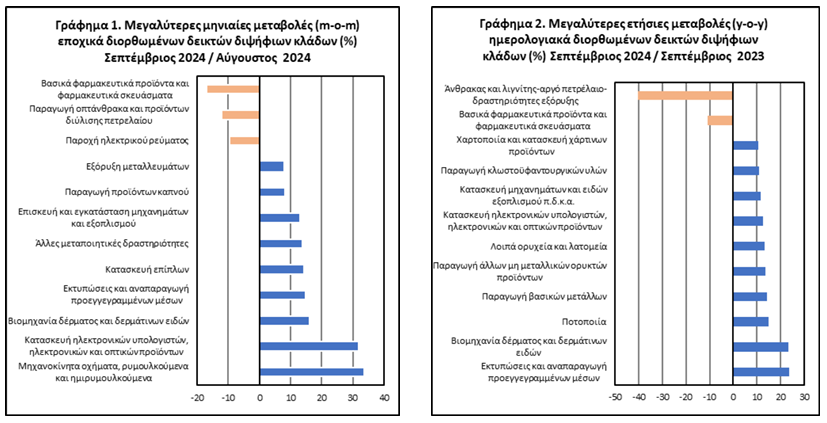 Ενώ, ο εποχικά διορθωμένος γενικός δείκτης παρουσίασε μείωση 2,1% το Σεπτέμβριο 2024 σε σύγκριση με τον αντίστοιχο δείκτη του Αυγούστου 2024.