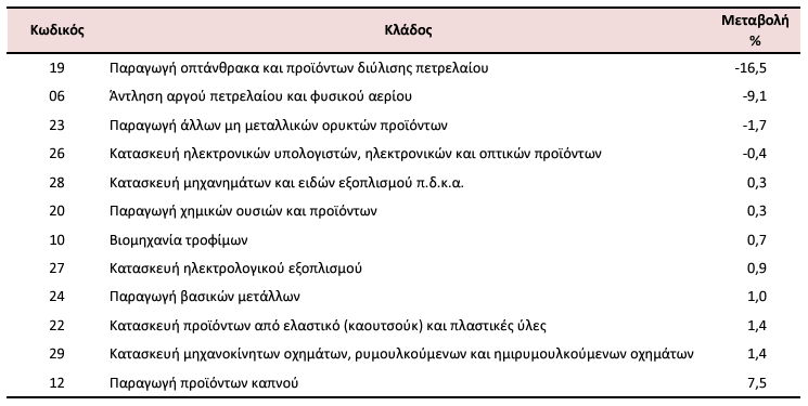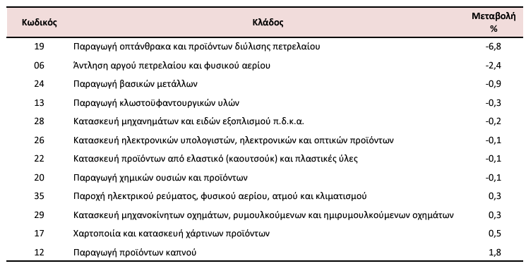 Στη μείωση του Γενικού Δείκτη Τιμών Εισαγωγών (σύνολο αγοράς) κατά 4,3% συνέβαλαν κυρίως οι μεταβολές των δεικτών των διψήφιων κλάδων της ταξινόμησης NACE Αναθ. 2, ως εξής:
