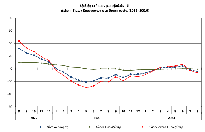 Η μείωση του Γενικού Δείκτη Τιμών Εισαγωγών κατά 4,3%, τον μήνα Αύγουστο 2024, σε σύγκριση με τον αντίστοιχο δείκτη του Αυγούστου 2023, οφείλεται:
