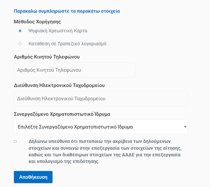 Οι δικαιούχοι του μέτρου υποβάλλουν την αίτησή τους ηλεκτρονικά στο vouchers.gov.gr, με τη χρήση των κωδικών διαπιστευτηρίων της Γενικής Γραμματείας Πληροφοριακών Συστημάτων Δημόσιας Διοίκησης (Taxisnet). Ο αιτών συμπληρώνει και επικαιροποιεί τα στοιχεία επικοινωνίας του και, ειδικότερα, τη διεύθυνση ηλεκτρονικού ταχυδρομείου και τον αριθμό του κινητού τηλεφώνου. Εφόσον επιλεγεί ως μέθοδος χορήγησης η «Κατάθεση σε τραπεζικό λογαριασμό», απαιτείται και η συμπλήρωση του IBAN του προσωπικού τραπεζικού λογαριασμού ή λογαριασμού στον οποίο ο δικαιούχος είναι συνδικαιούχος.