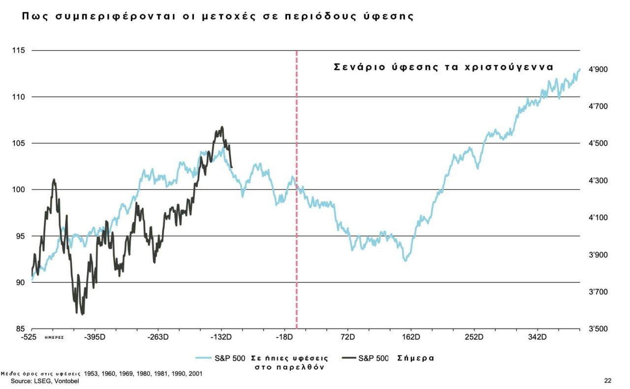 Το μοτίβο είναι κι εδώ φανερό και το συμπέρασμα είναι ότι εάν επιβεβαιωθεί το σενάριο της ύφεσης τα Χριστούγεννα, είναι πολύ πιθανό οι τιμές των μετοχών να υποχωρήσουν για περίπου ένα εξάμηνο και να ανακάμψουν στη συνέχεια.